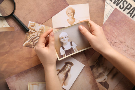 Female hands with old photos of relatives on wooden background. Concept of family tree