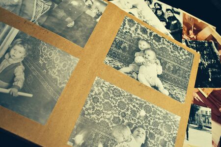 Family traditions, memore and nostalgia concept. Vintage photo frame and old photos on faily album on wooden board background.