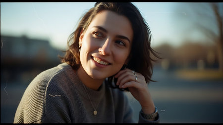 Cheerful woman smiling outdoors, celebrating the beginning of the year 2025. Perfect image for New Year and festive content.