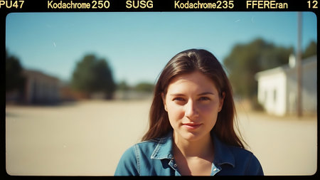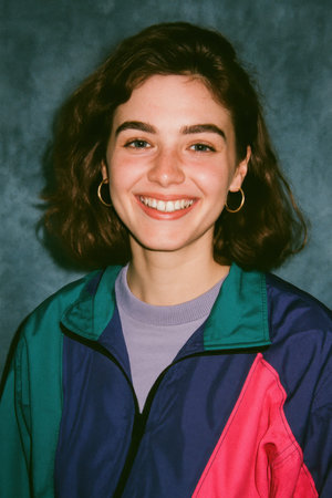 A close-up portrait of a young woman with wavy hair, wearing earrings and a stylish outfit, against a neutral background
