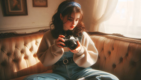 A person examines an old portrait in a collection of vintage photographs, surrounded by aged images and memorabilia, evoking nostalgia and curiosity about the past.
