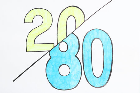 Text sign showing 80 to 20 percent. Pareto principle of factor sparsity Statistical distribution of data