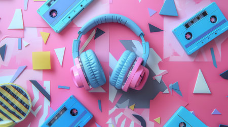 Retro musical background wiht Headphones and retro cassette tapes, pink blue yellow colorful geometric style. Nostalgia for the 90s. Musical concept. Generative ai.