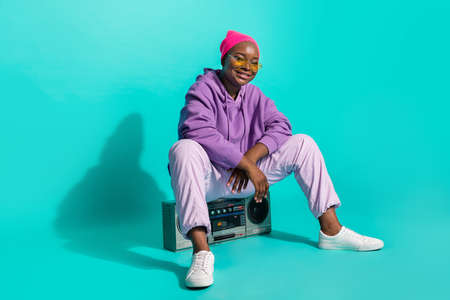 Portrait of attractive cheery girl carrying boombox listening hip hip isolated over bright teal turquoise color background