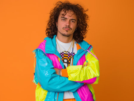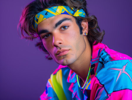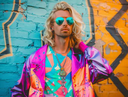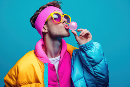 Trendy young man in colorful 80s-style neon clothes blows bubble gum, evoking fun, vintage style, and street fashion.