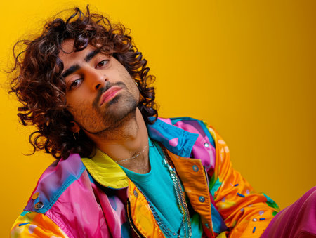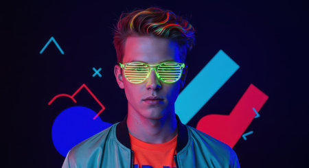 Young male model posing with trendy man fashion outfit and colorful vibrant glowing green and pink optical art abstract background. Picturesque generative AI