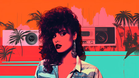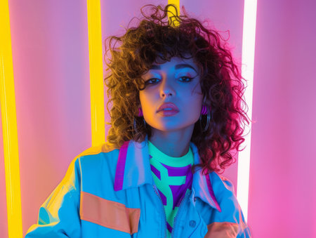 Retro inspired woman with 80s fashion and soft curls portrait image, ai generated. Curvy lady with geometric vintage jacket picture photorealistic photography. Nostalgic vibe concept photo realistic