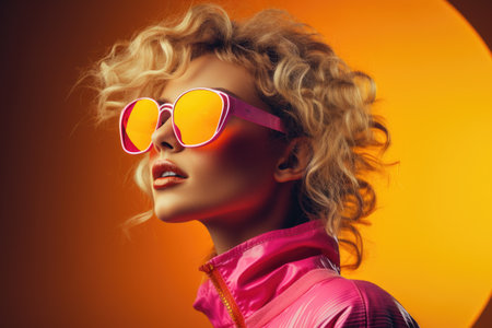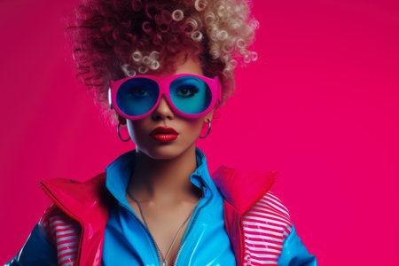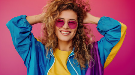 Happy curly hair woman in retro jacket and pink sunglasses portrait image, ai generated. Female joyful expression picture photorealistic photography. Positivity and energy concept photo realistic