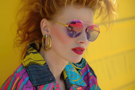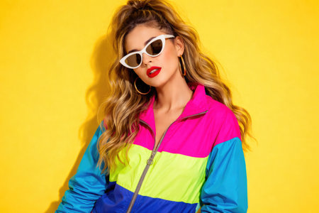 A young woman poses confidently wearing a colorful jacket and stylish sunglasses with a bold yellow wall behind.