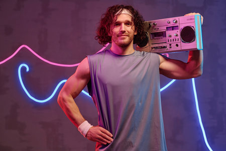 Caucasian athlete in retro sportswear posing with boombox against neon light background