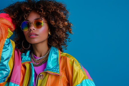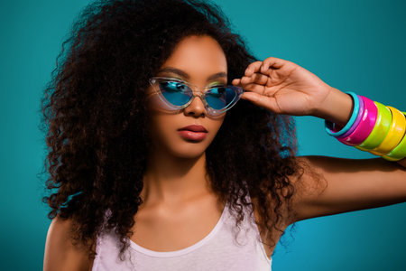 Classy young woman with curly hair wearing sunglass and colorful bracelets against a vibrant turquoise backdrop