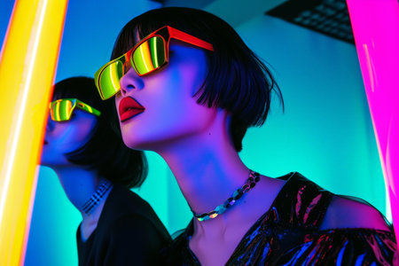 Two young women with bright makeup and stylish clothing standing in an urban setting with neon lighting. The concept of contemporary fashion and youth culture.