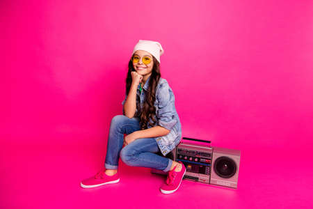 Full length side profile body size photo beautiful little she her curly lady sit old-fashioned tape sound audio recorder wear yellow sun specs hat casual jeans denim jacket isolated pink background