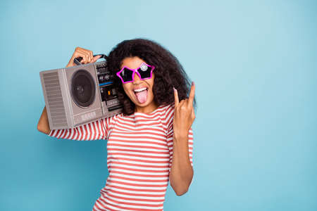 Photo of stylish trendy cheerful cute nice heavy metal fan sticking out showing you rocker sign fingers horned holding radio recorder wearing striped t-shirt isolated over blue pastel color background