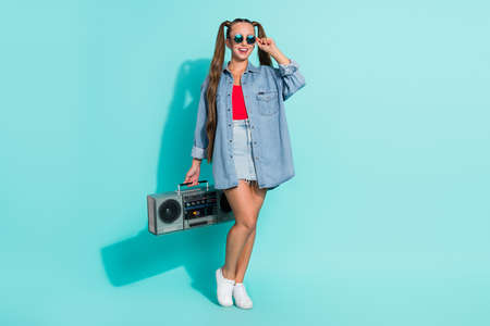 Photo of attractive sweet young woman dressed denim jacket arm dark glasses smiling listening boom box isolated teal color background