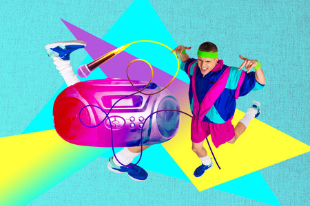 3D collage trend artwork composite sketch poster of boombox retro style young guy dance sing microphone nightclub rest occasion weekend