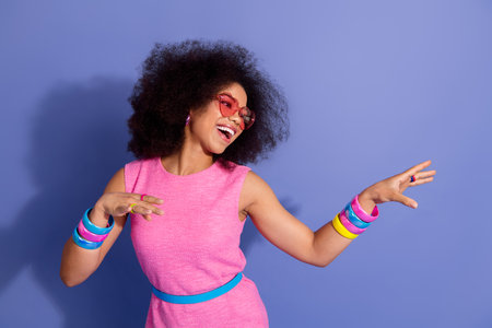 Smiling Trendy Woman in Pink Dress With Afro Hair and Colorful Accessories on a Purple Background Expressing Joy