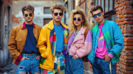 A group of stylish individuals dressed in retro-inspired outfits relaxing outdoors and showing camaraderie. The vibrant colors and accessories contribute to a sense of friendship and nostalgic lifestyle.