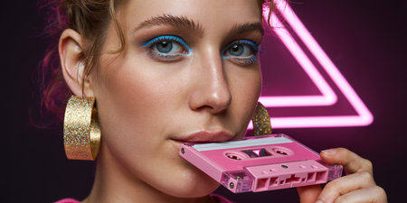 Close-up of stylish woman with blue eye makeup holding pink audio cassette near lips against neon background, retro music vibe.