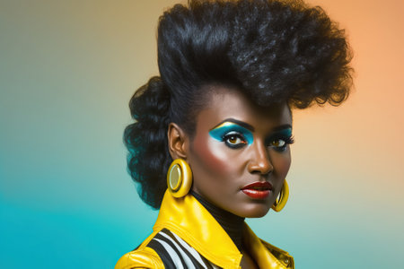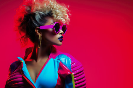 Beauty fashion model african american girl, bright shiny make-up and clothes in disco style. 80s-90s nostalgia concept,