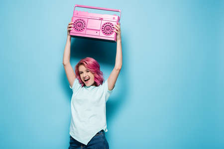 A fashionable girl in bright colorful retro-style clothes on a blue background enjoys the atmosphere of the 80s - 90s.