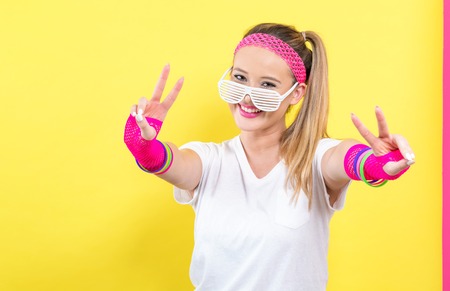 Woman in 1980s fashion giving the peace sign on a split yellow background