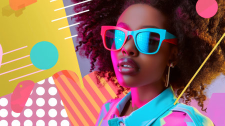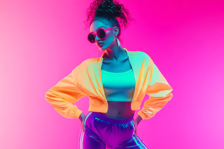 A stylish young woman poses confidently in oversized sunglasses, showcasing a trendy outfit against a vivid pink and blue background.
