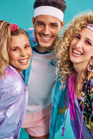 Ready for some 80s fun. Shot of three young people posing together in 80s clothing against a blue background.