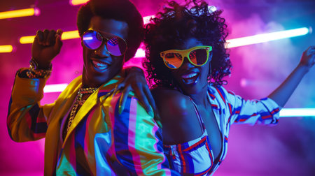 80s Retro Bash: Colorful costumes, neon lights, group of friends dancing to classic hits in nostalgic celebration.