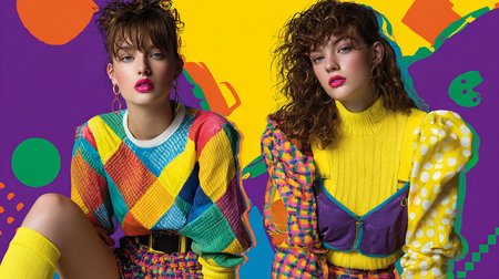 Fashion shot of two young women in colorful clothes posing over colorful background.