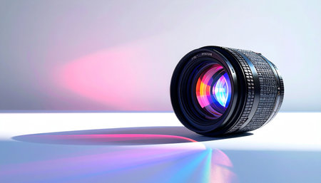A professional camera lens rests on a reflective surface, bathed in vibrant pink and blue cinematic light. The colorful reflections in the glass and the long shadow suggest a world of creative potential, from filmmaking to artistic photography, capturing a moment of modern technological artistry.
