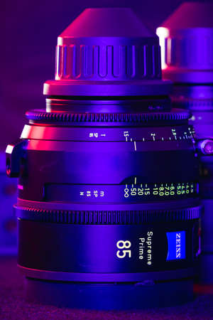 Kyiv, Ukraine - 04.17.2020: Studio shoot of professional lens Zeiss Supreme Prime, close-up. Professional equipment for cinematographer, movie technology