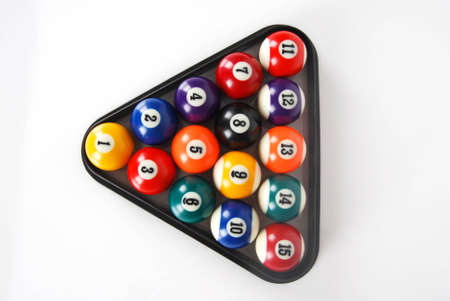 American billiard poule. Triangle of billiard balls. A man getting ready to start a game of billiards.