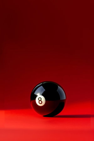 A vibrant red backdrop featuring a classic black and white billiard ball, symbolizing fun and leisure Perfect for sports themed designs and decor