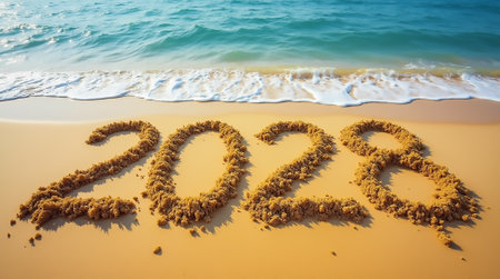 The year 2028 is artistically drawn in sand on a bright beach, as soft waves of the ocean lap against the shoreline, creating a serene atmosphere.