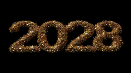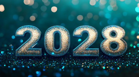 Festive and luxurious golden numbers 2028 adorned with glitter and light create a vibrant and cheerful background for New Year celebrations.