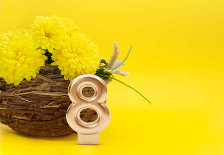 Bouquet of chrysanthemums in a jute vase and number 8 on a yellow background. Gift for International Women's Day, March 8, birthday. Copy space