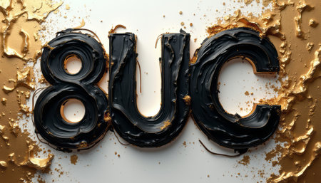 The image features the bold, stylized letters 8UC crafted from glossy black material, surrounded by shimmering gold flakes on a pristine white background. This striking composition exudes luxury and modernity, making it perfect for branding or artistic projects.