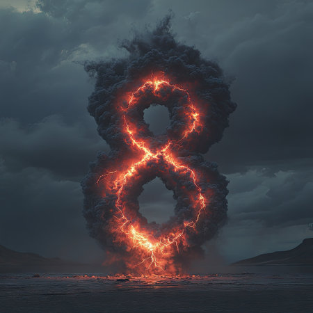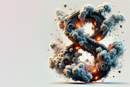 The burning number 8 in clouds of smoke. Space for text