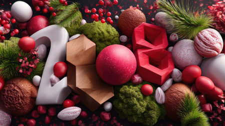 An artistic composition featuring vibrant numbers 2018 surrounded by colorful festive elements, including spheres, moss, and natural textures ideal for holiday themes.