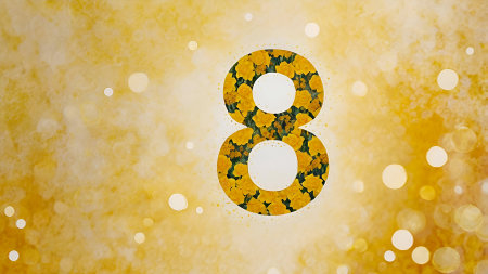 International Women's Day. The holiday falls on March 8th. Banner, flyer. Festive yellow floral background with the number 8.