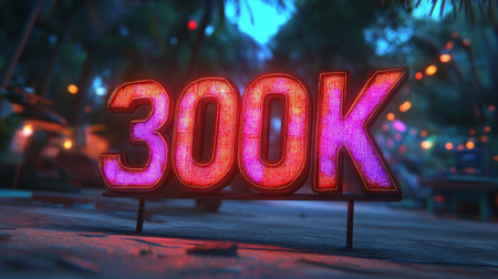 Glowing Digital 3D Number 300K in Futuristic Red and Purple Neon Style on a Tropical Beach at Night