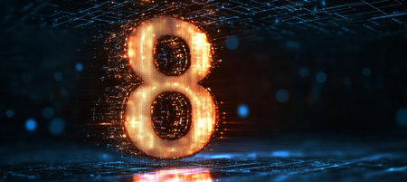 Glowing Digital 3D Number 8K With Futuristic Rendering On Glowing Rectangular Grid Background