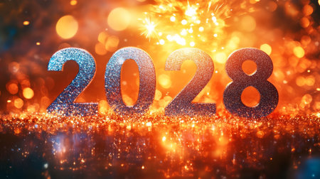 Sparkling New Year Celebration Background with Glowing Metallic 2028 and Festive Bokeh Lights Design