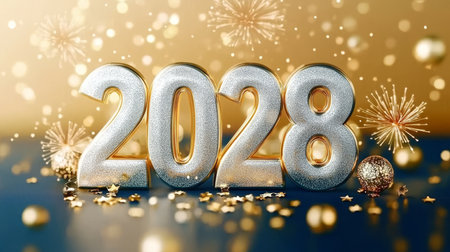 New Year 2028 Background Silver Numerals Festive Fireworks Sparkling Confetti on Blue and Gold