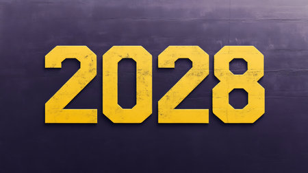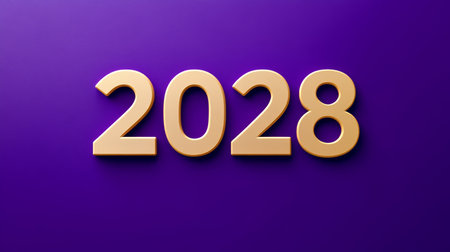 Year 2028 Bold Yellow Numbers, Weathered Texture, Deep Purple Background, Achievement Concept.