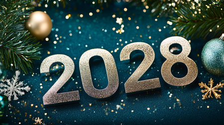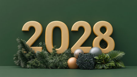 New Year 2028 Celebration Golden Numbers And Festive Decorations On Green Background