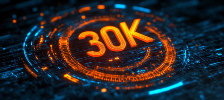 Futuristic Digital Triumph Celebrating Glowing 30K Milestone in Technology Achievement Visualization