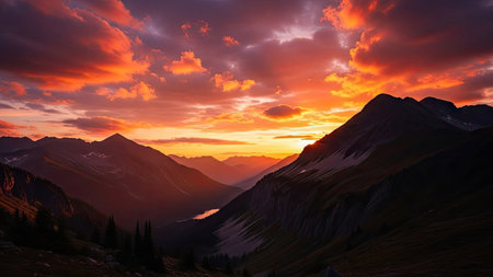 Panoramic view of alpine lake and mountains at sunset, Switzerland