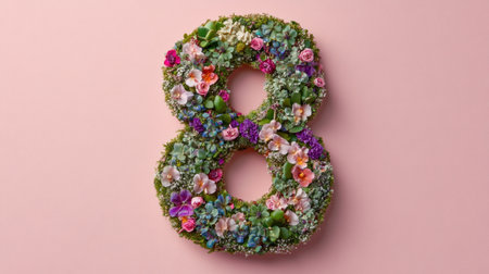 Photo of the number '8' decorated with flowers on a light pink background, representing International Women's Day. Web banner icon design. --chaos 30 --ar 16:9 --v 6.1 Job ID: 2fc19e87-3a55-4dbe-b92e-1105a3880613